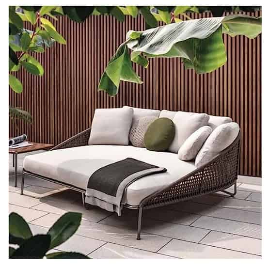 The sofa set described here combines a powder-coated iron frame with all-weather rope to create a sturdy and durable furniture option for your outdoor space