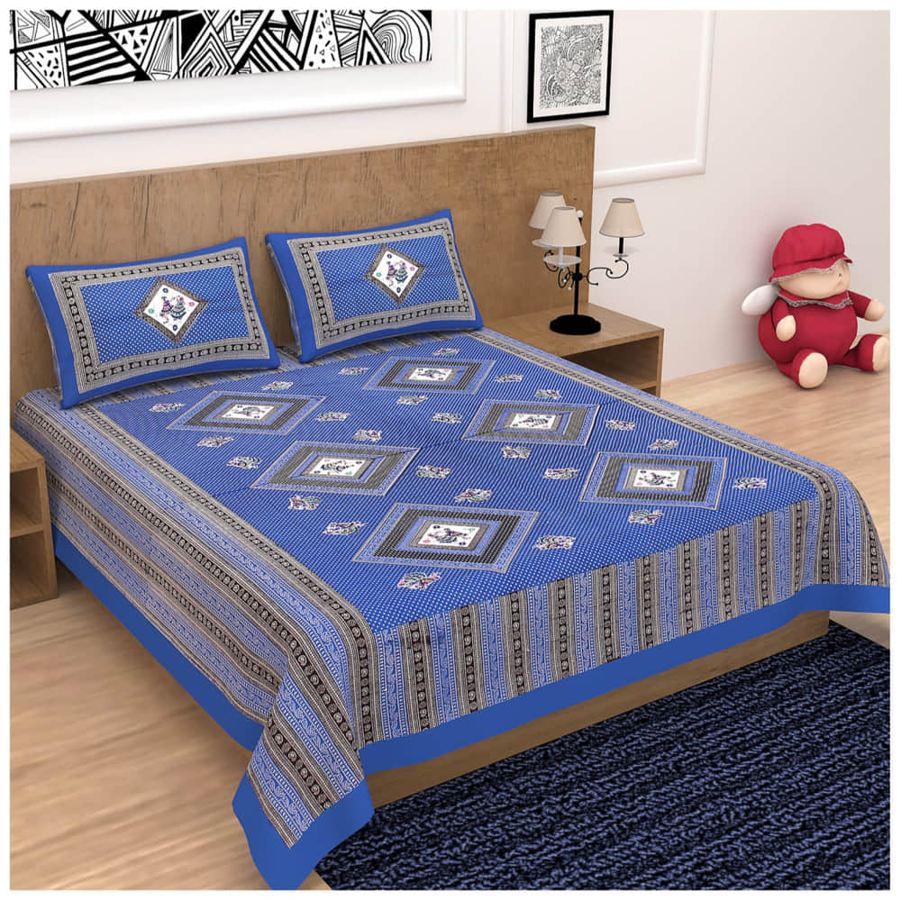Cotton Double Bedsheet With Pillow Covers Jaipuri Print - Blue