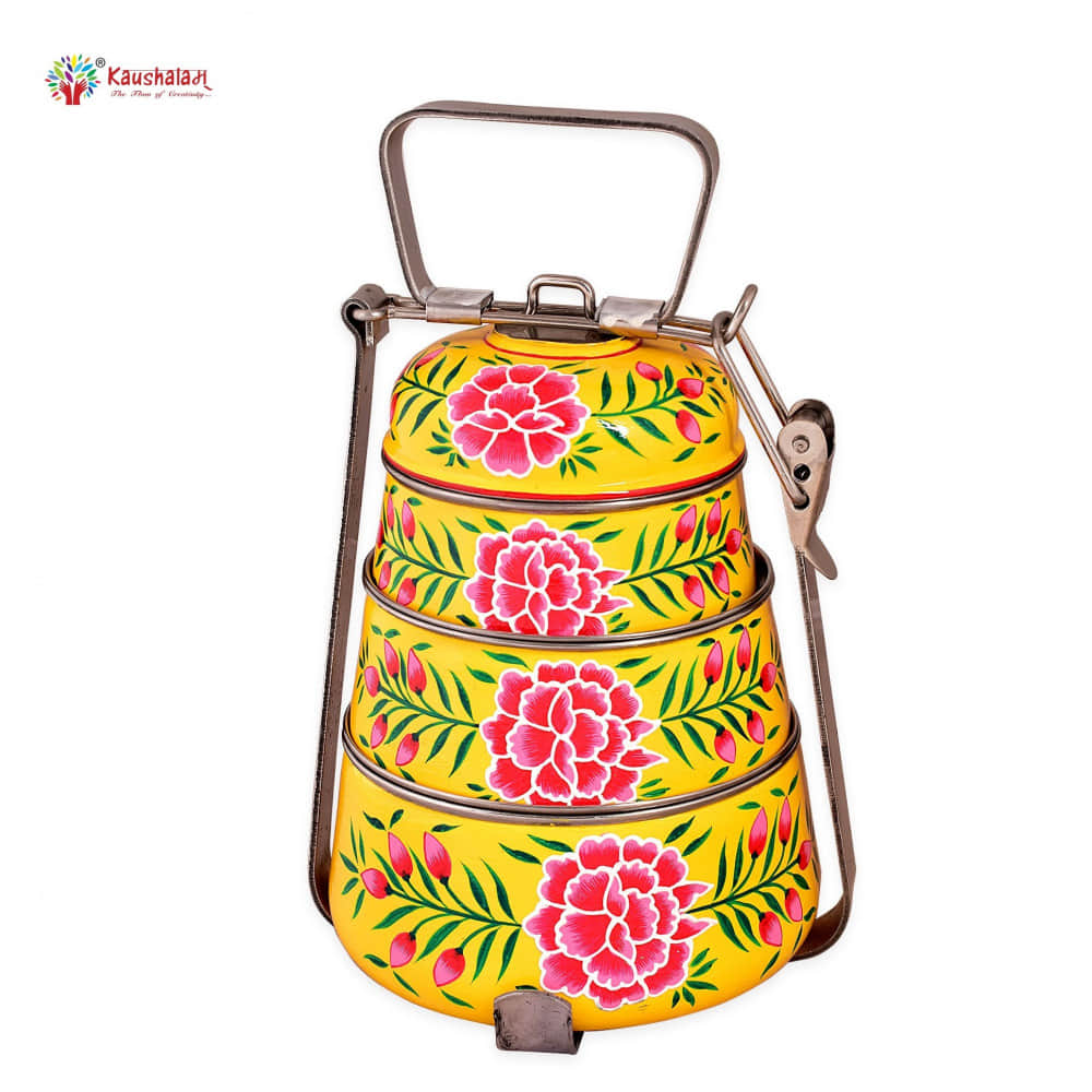 Hand Painted 3 Tier Steel Pyramid Lunch Box- Peach Kashmiri Art