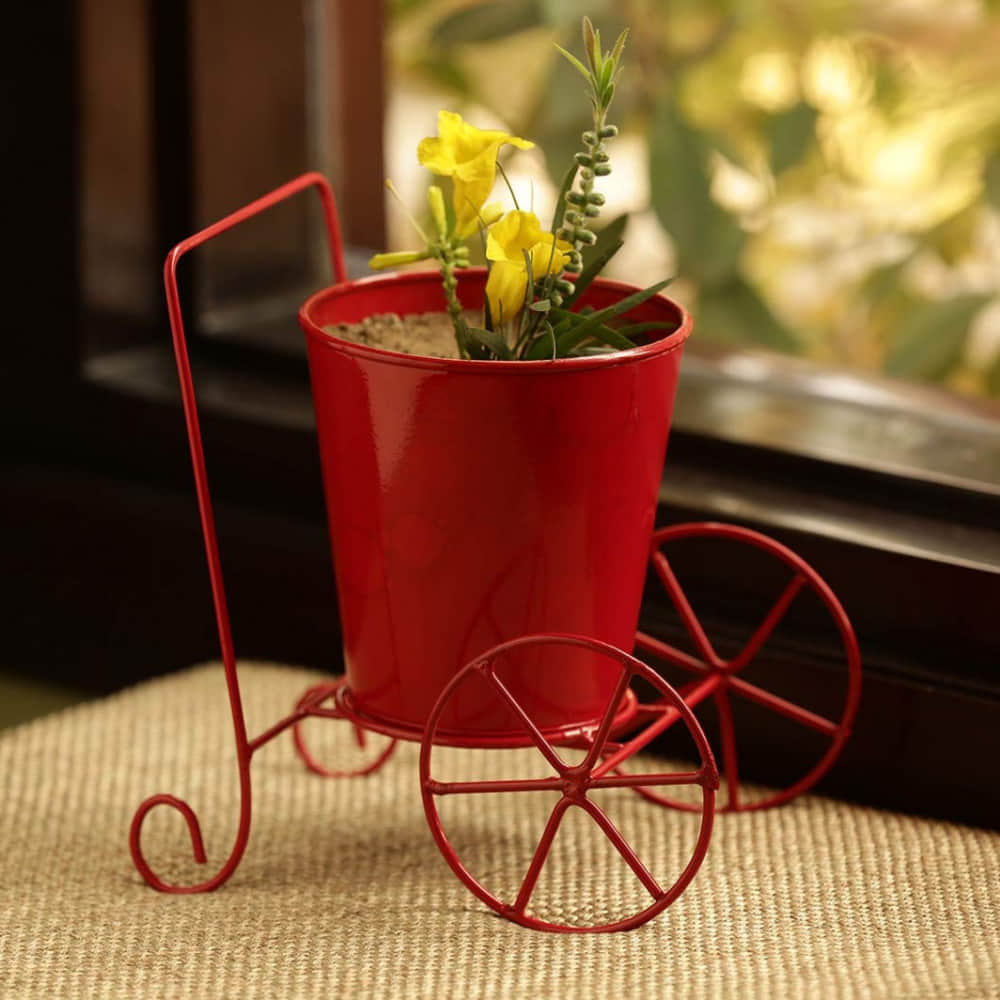 Home Decor 'plant On Wheels' Table And Floor Decorative Metal Flower Planter Pot 1 Planter, 1 Stand (glossy Red, 7.3 * 5.0 * 7.1inch)