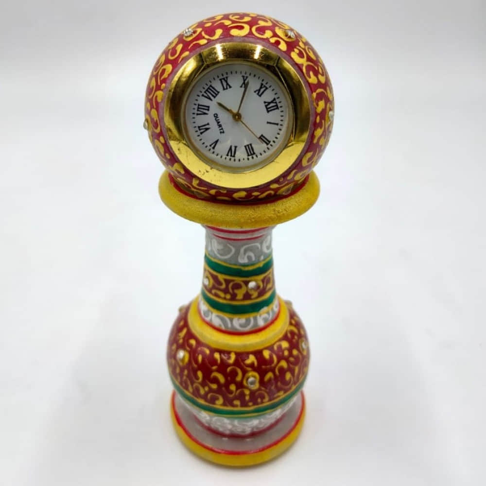 White Makrana marble pillar watch decorated with meena colour and gold embossed with clock dial fitting suitable for office tables and gifting purpose