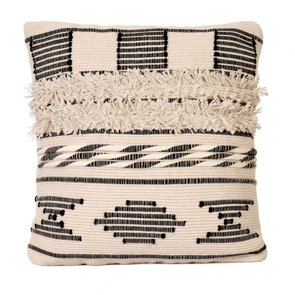 Nomaadi Boho Black & Ivory Fuzzy 18 X 18 Inches Handcrafted Cotton Cushion, Throw Pillow Cover For Home Decor Handmade Rug Pillow Cover For Sofa Antique Design Cushion Cover For Living Room Decor | Pack Of 1