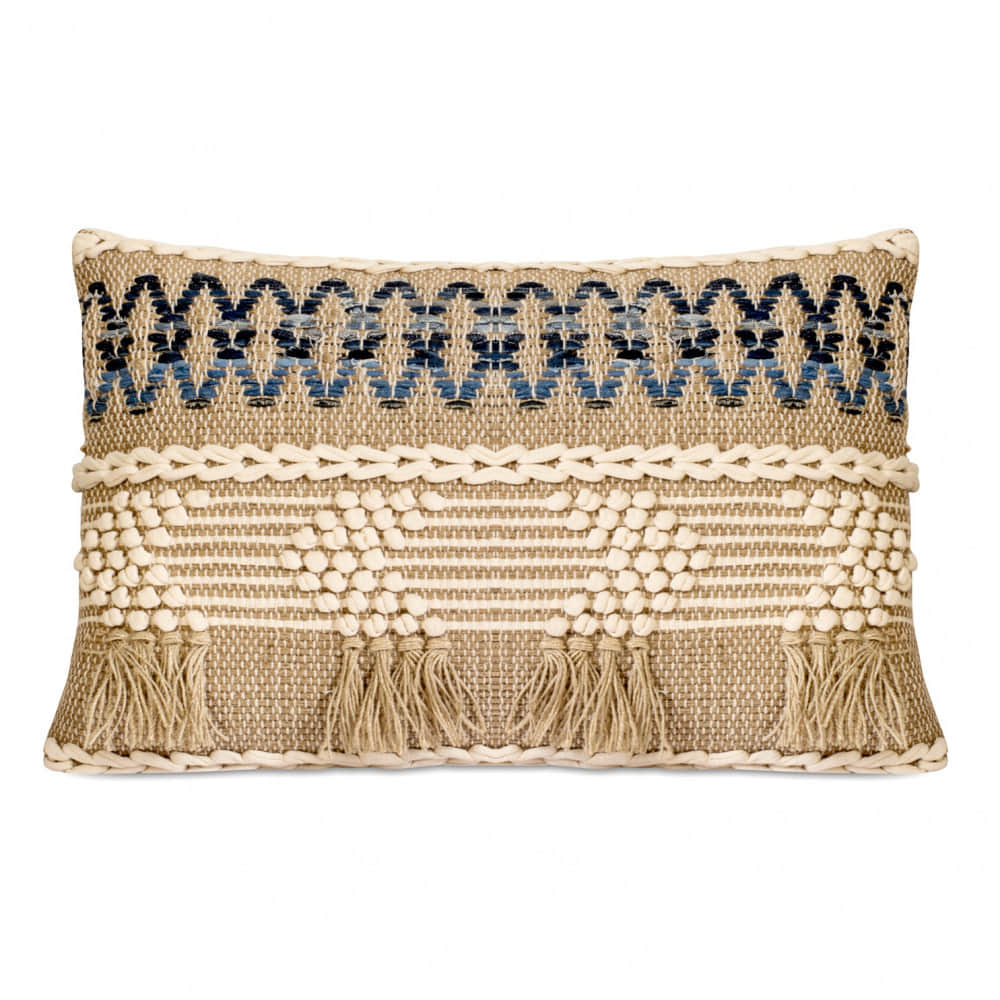 Handwoven denim and jute boho lumbar cushion cover combination of colors with a contrast of neutral, beige & denim colors