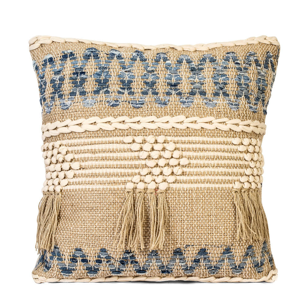 Handwoven denim and jute boho cushion cover, a combination of colors with a contrast of neutral, beige & denim colors