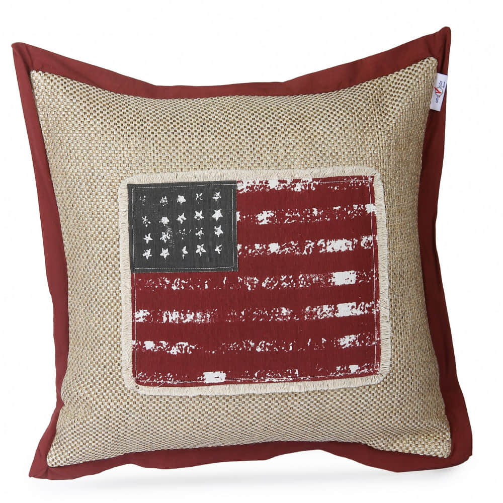 This Vintage American Flag Decorative Cushion cover is in a digital print on a beige Cotton with a jute look alike base