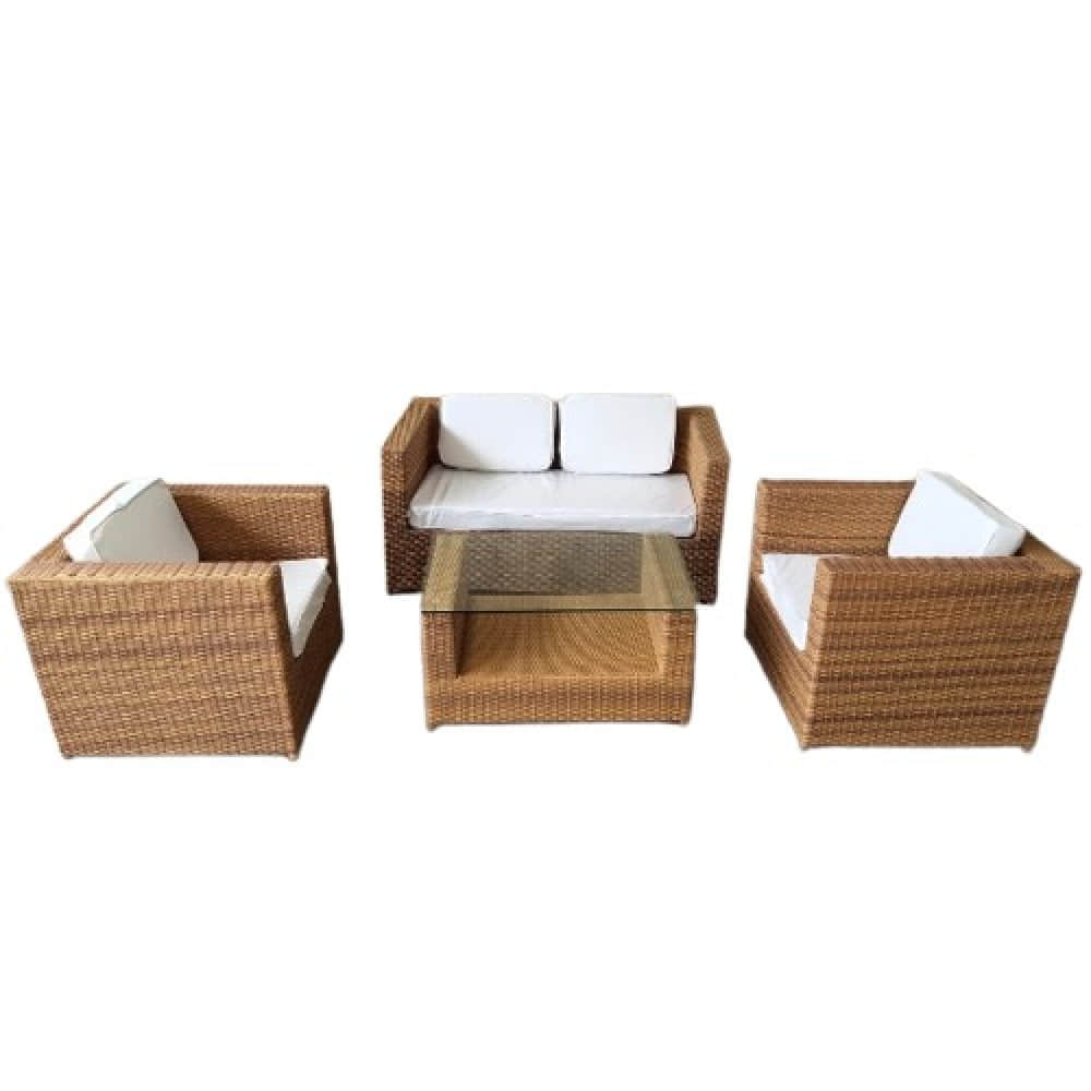 All-weather synthetic PE resin wicker packed around steel frames for durability and beauty