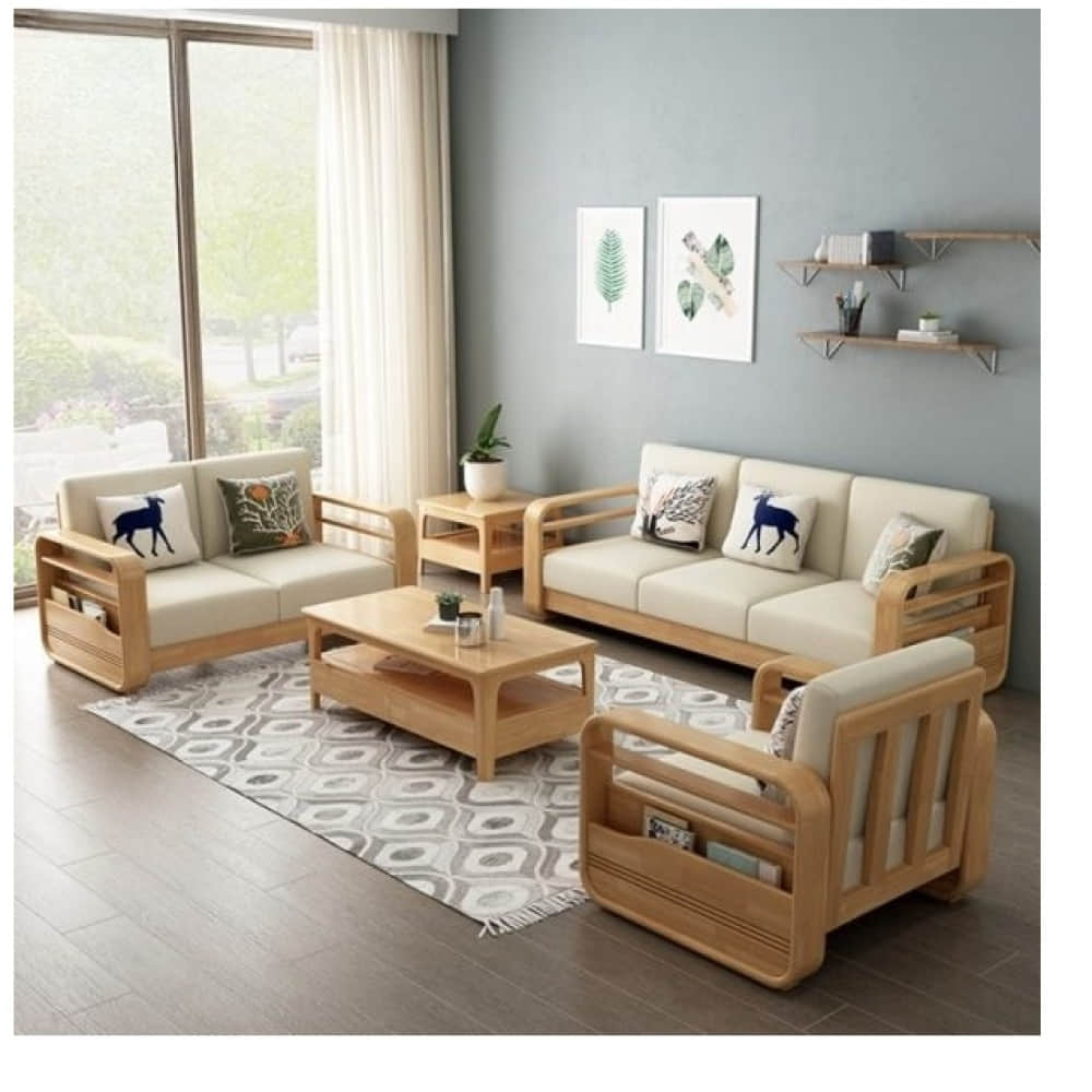 Scandinavian Beige Solid Mango Wood 5 Seater Sofa Set
