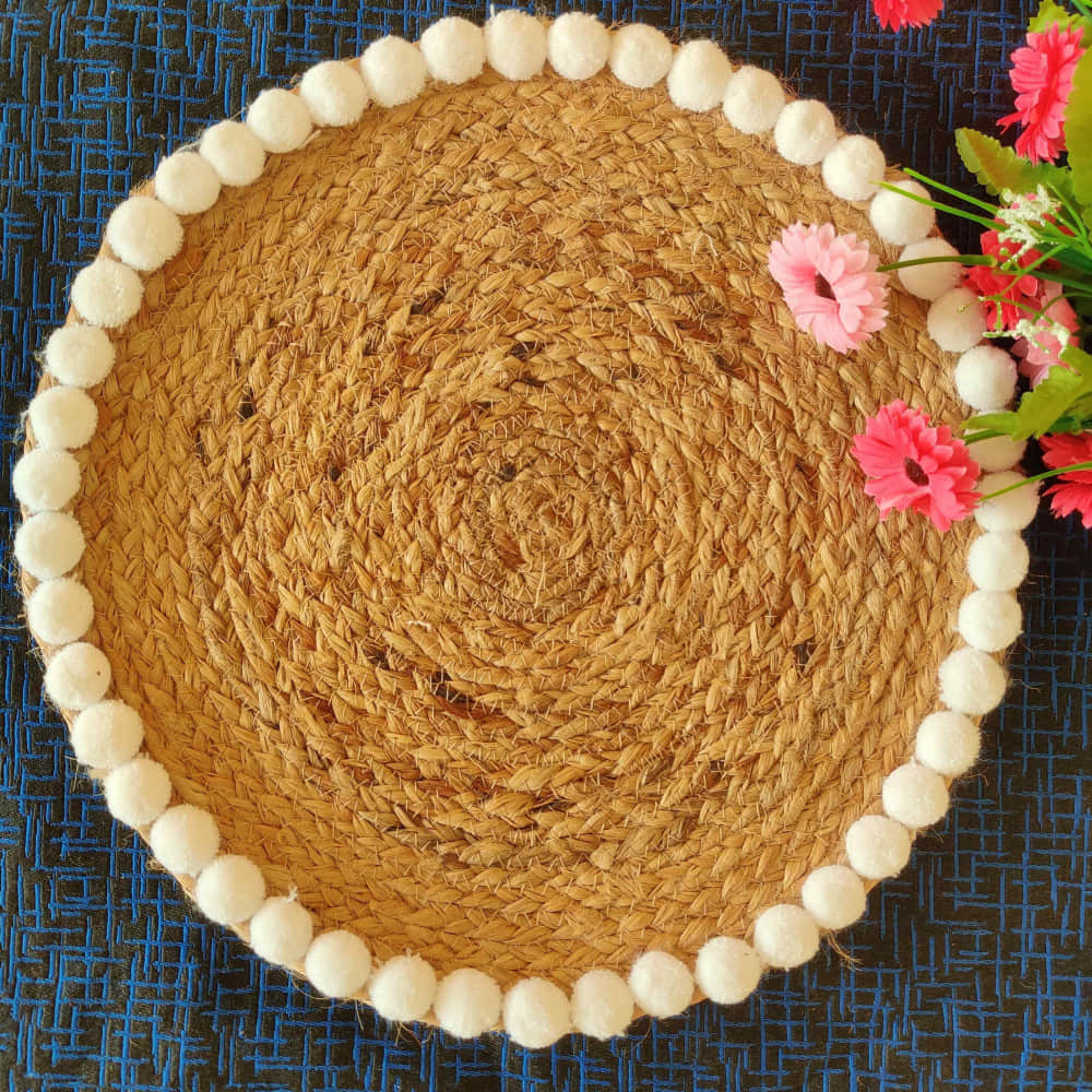 Jute White Pompom Border Mat