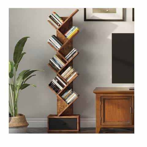 Rustic Brown 8 Shelf Tree Bookshelf With Drawer