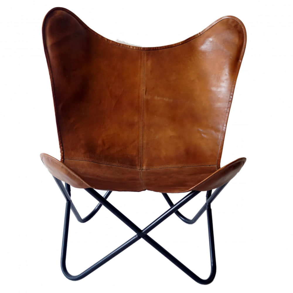 Butterfly chair with Leather Seat Metal frame with powder coating Classic design and comfortable Easy to move and clean Knockdown Stand Cover Material- Leather & canvas, Frame Material - Iron Pipe Made from genuine leather, this retro butterfly chair cover is durable and built to last