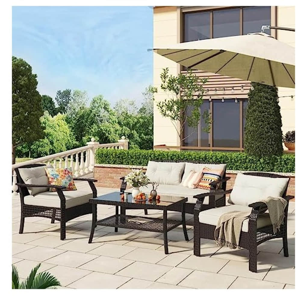 The wicker patio chairs and love seat with a checkered pattern from Apkainterior offer a simple and elegant design that adds a touch of classic style to any outdoor living space