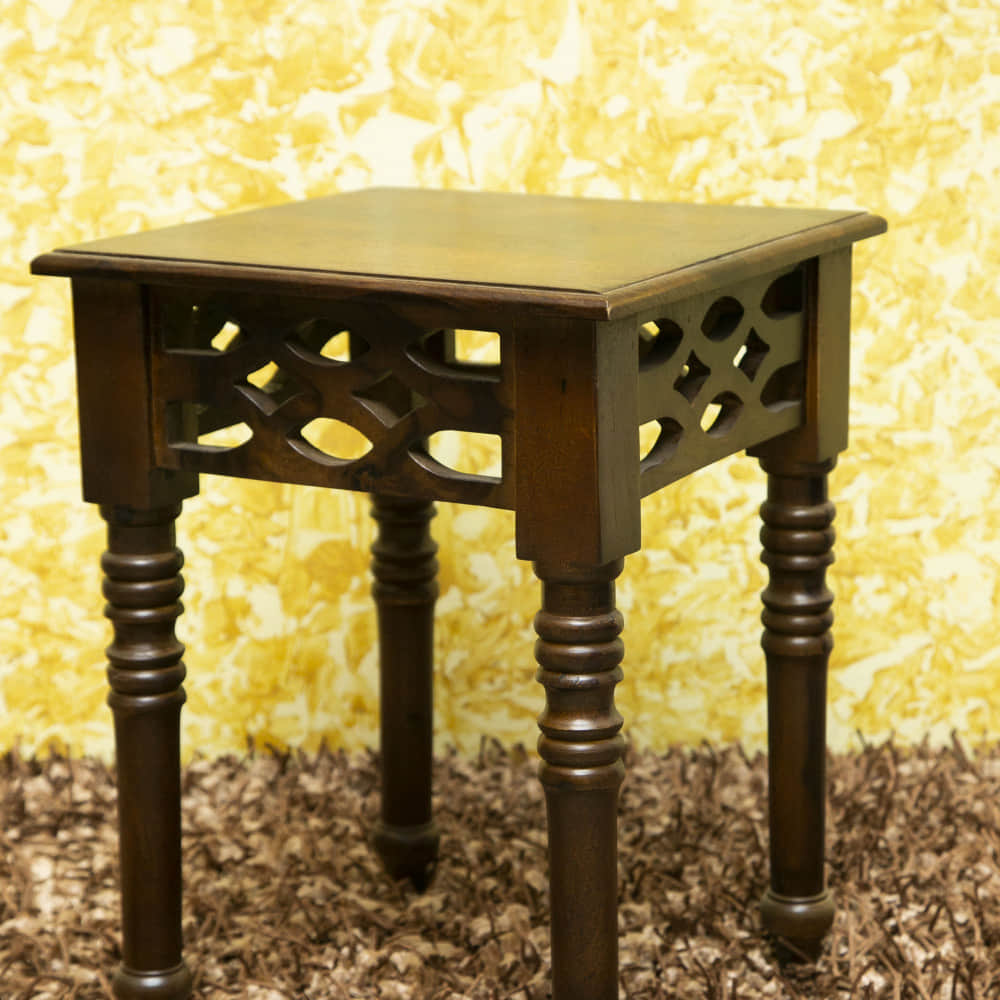 The dark-toned sheesham wood that accents the corners; and the skillfully turned legs that give it reassuring durability